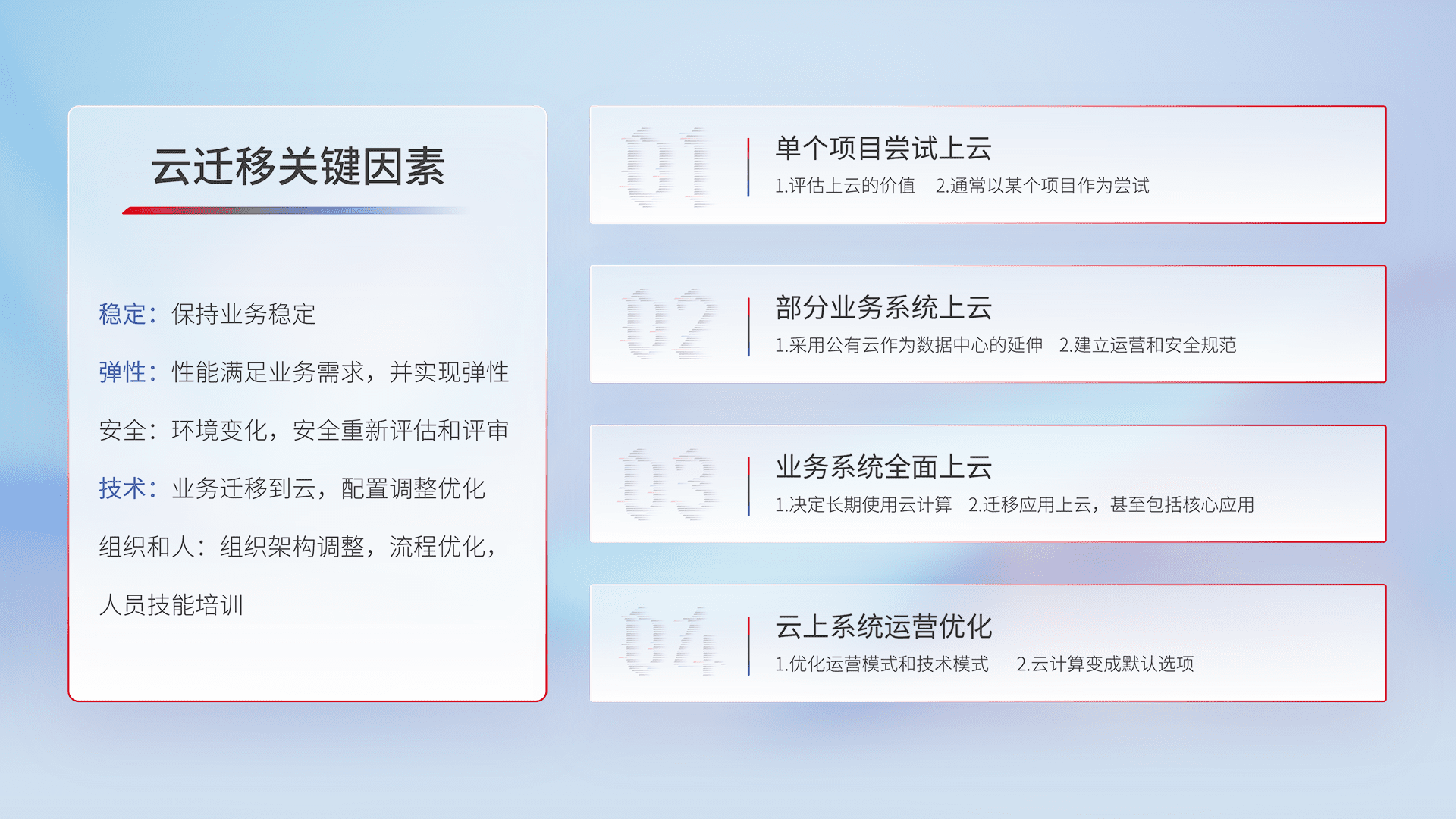 结合实际业务,,,从规划设计、、云平台选型、、、云原生改造、、数据迁移、、、、集成交付,,,迁移全过程为客户识别最佳上云路径,,,做好风险识别管理,,设计网络架构、、身份权限、、安全审计合规、、操作审计、、、、日志审计、、、监控告警策略、、、、多站点容灾设计等,,,对云上基础设施进行整体规划,,提升IT治理水平,,以满足弹性、、、、高可用、、、高性能的需求。。