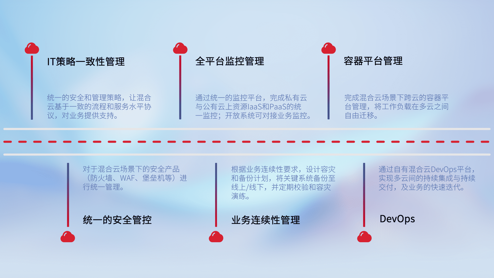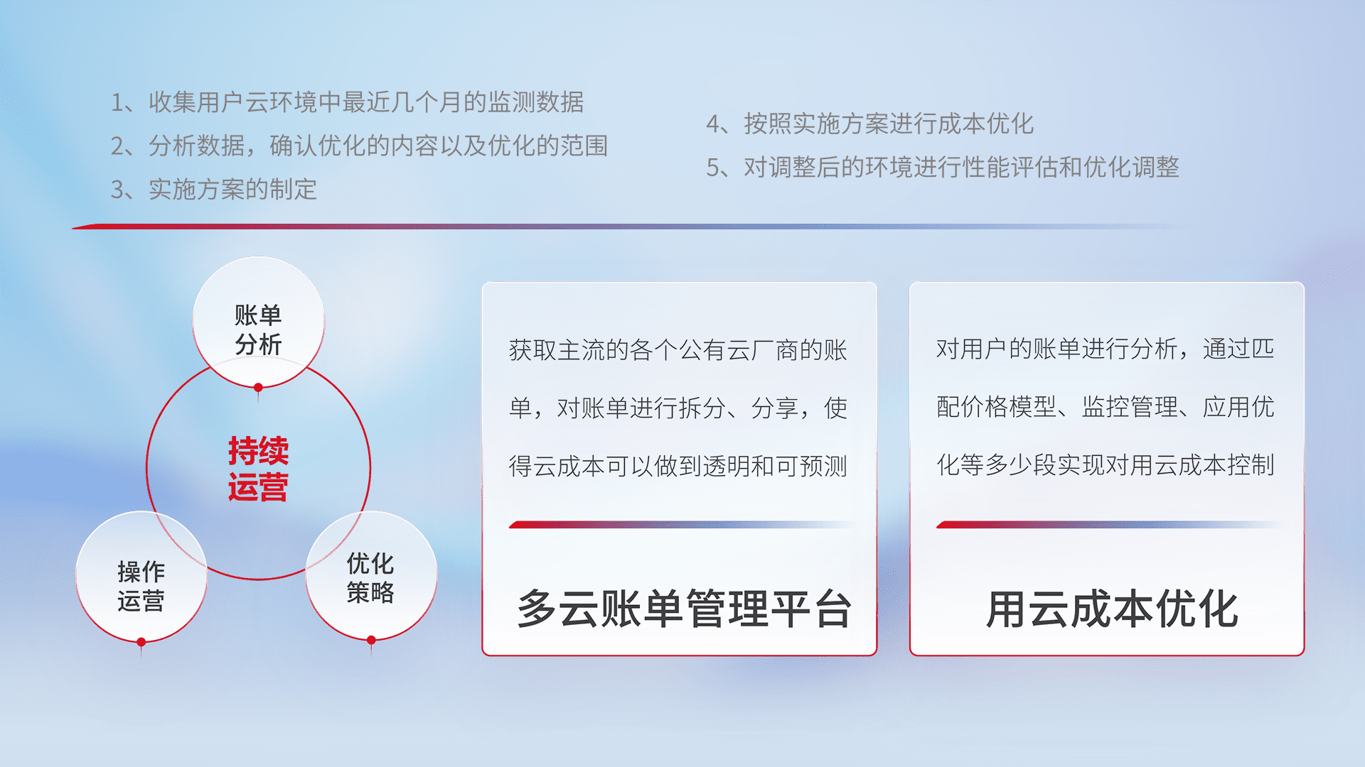 通过多云纳管,,以统一的资源数据模型把客户的云资源进行抽象和封装,,进而实现对多云资源的统一操作,,,,保障云资源管理的可靠性、、、稳定性与可用性。。。。量身定制化运维内容,,,配置、、、开发运维、、、补丁管理、、、备份、、、、监控、、、、认证和访问管理、、、审计和日常巡检等,,,,保障在用云过程中的可靠度,,,,稳定度以及高可用率。。